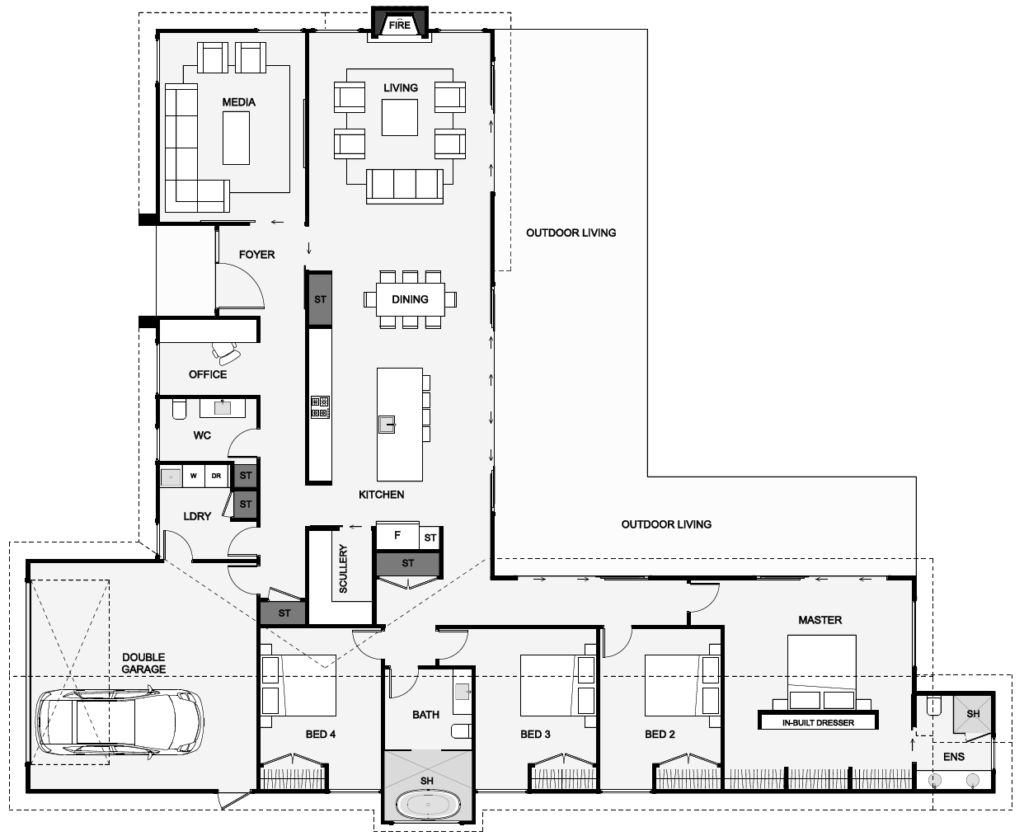 This home creates a large outdoor space with its unique “L’ shaped design. The spacious open plan living, dining, kitchen and scullery, all look out onto the large outdoor living area giving the home a family hub feel. A smart office positioned close to the entry makes working at home a real option. This effortless family home has everything and your family could want and then some!